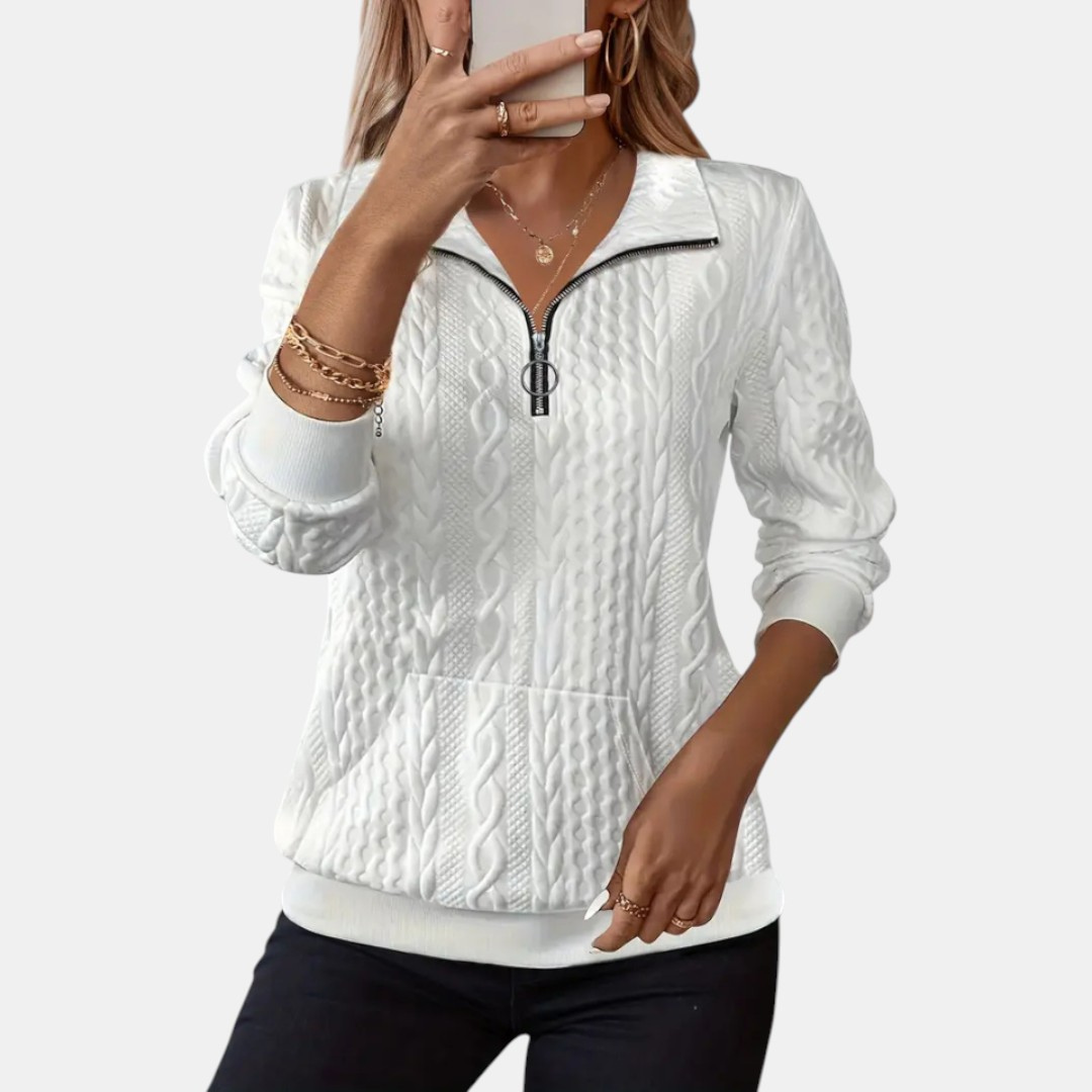 Geniet van zachte warmte en een flatterende pasvorm met deze dames trui met lange mouwen. De subtiele snit volgt soepel je lichaamslijn, terwijl de verfijnde ritssluiting zorgt voor een elegante touch. Ideaal voor dagen waarop je er verzorgd uit wilt zien en je toch volledig comfortabel wilt voelen.